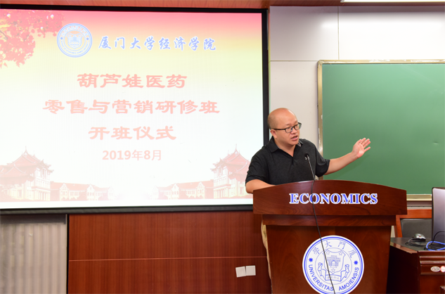 在开班仪式上,廖景峰主任首先代表厦门大学经济学院热烈欢迎豪门国际医药零售与营销研修班的学员到厦大学习,并就厦门大学及经济学院的相关情况进行了介绍。他说,豪门国际学员走进厦大就是厦大的校友,希望未来的日子能够关心、支持母校的发展,多提宝贵意见,同时他也祝大家在厦大学习期间学有所成、学有所获。